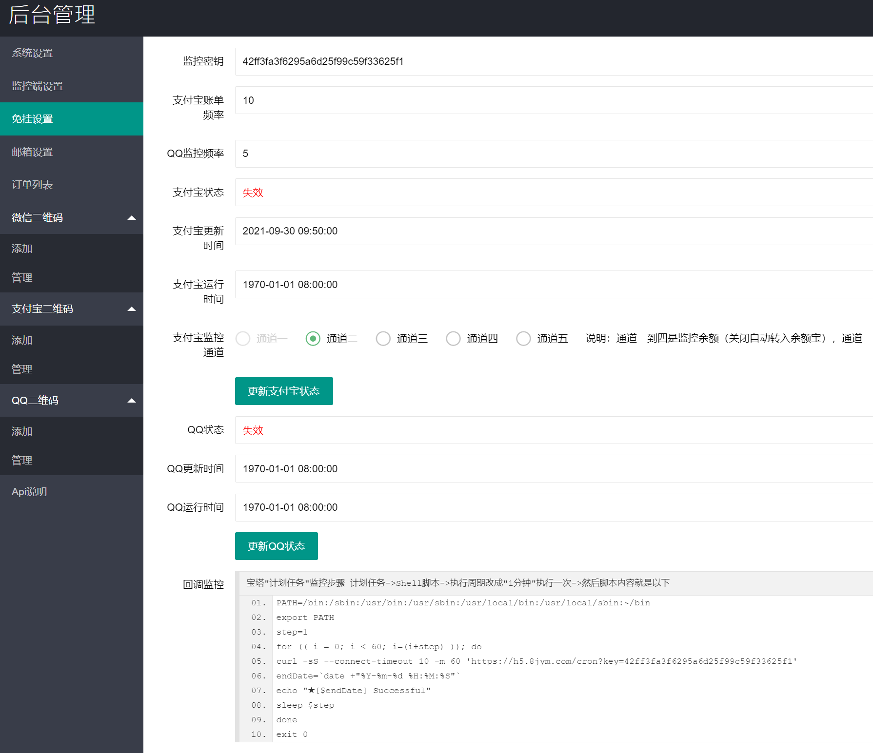 3、支付宝在之前设置过商户号,这一步略过,进入系统找到免挂设置,按照说明设置回调监控,设置完成同一个页面找到‘更新支付宝状态’,这时可看到支付宝状态显示‘正常’,设置完毕。(这一步并没有在电脑端运行支付宝PC监控端,而是用的免挂设置,不想设置免挂或者没有支付商户号的可以自行设置支付宝PC监控端)。