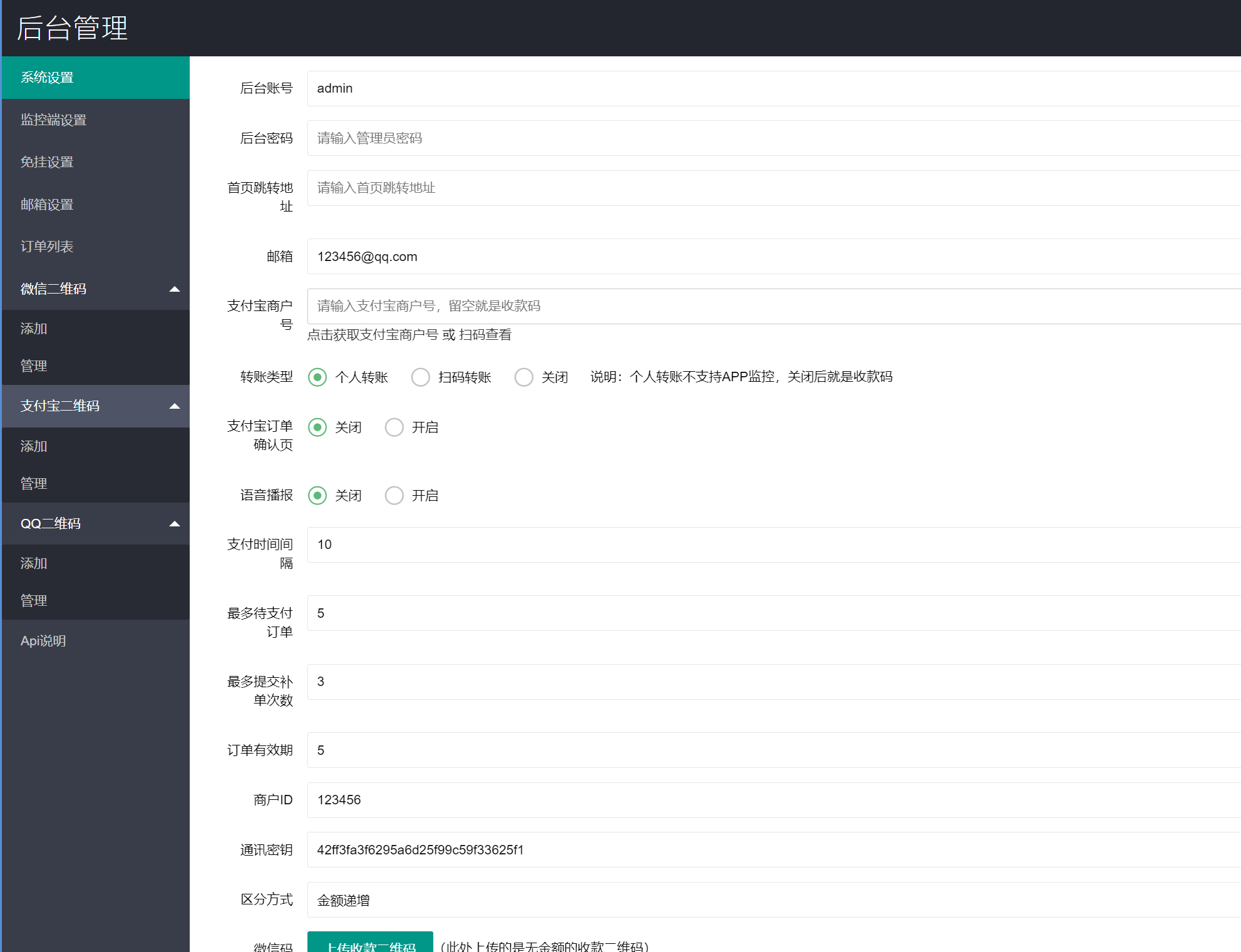 1、后台系统设置新的登录密码,添加邮箱,首页跳转地址,支付宝商户号(支付宝收款会用到,如何申请支付宝商户号,请点击查看“支付宝当面付申请”往期教程),上传微信收款码,支付宝收款码,其它根据需求自行修改(一般默认即可),然后保存。