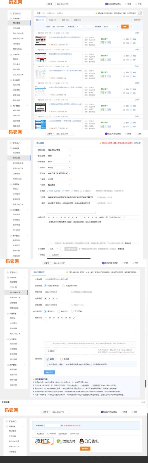 前台支持自助交易,源码交易,服务交易,网站交易,域名交易,任务交易,需求求购等多类型交易