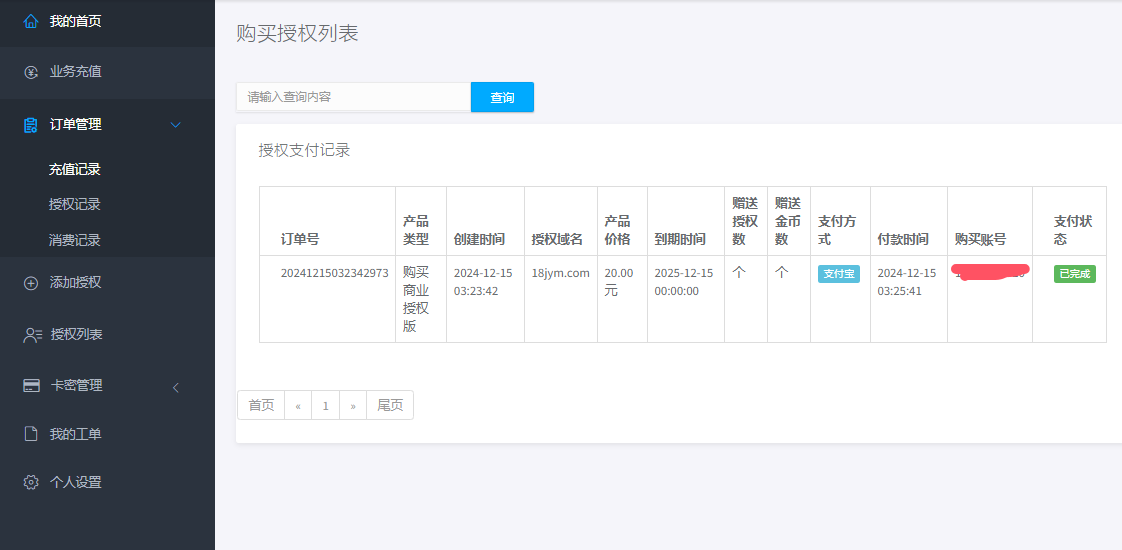 3、支付订单、充值订单、消费订单、生成卡密、卡密列表、卡密授权详情、卡密生成日志